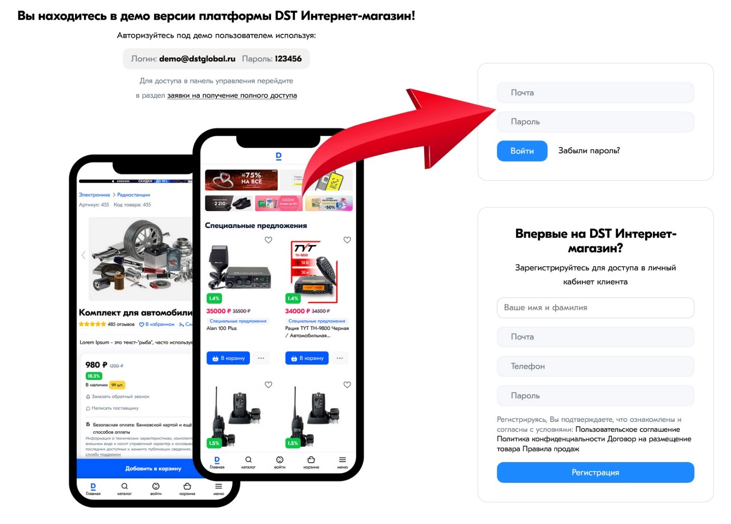 Для входа в панель управления перейдите на страницу регистрации и авторизации по следующему URL адресу: https://demo2.dstglobal.ru/auth/shop. Введите логин и пароль администратора, затем нажмите кнопку «Войти».