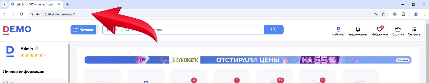 После успешной авторизации в адресной строке браузера введите URL https://demo2.dstglobal.ru/admin и нажмите на клавиатуре кнопку "Enter".