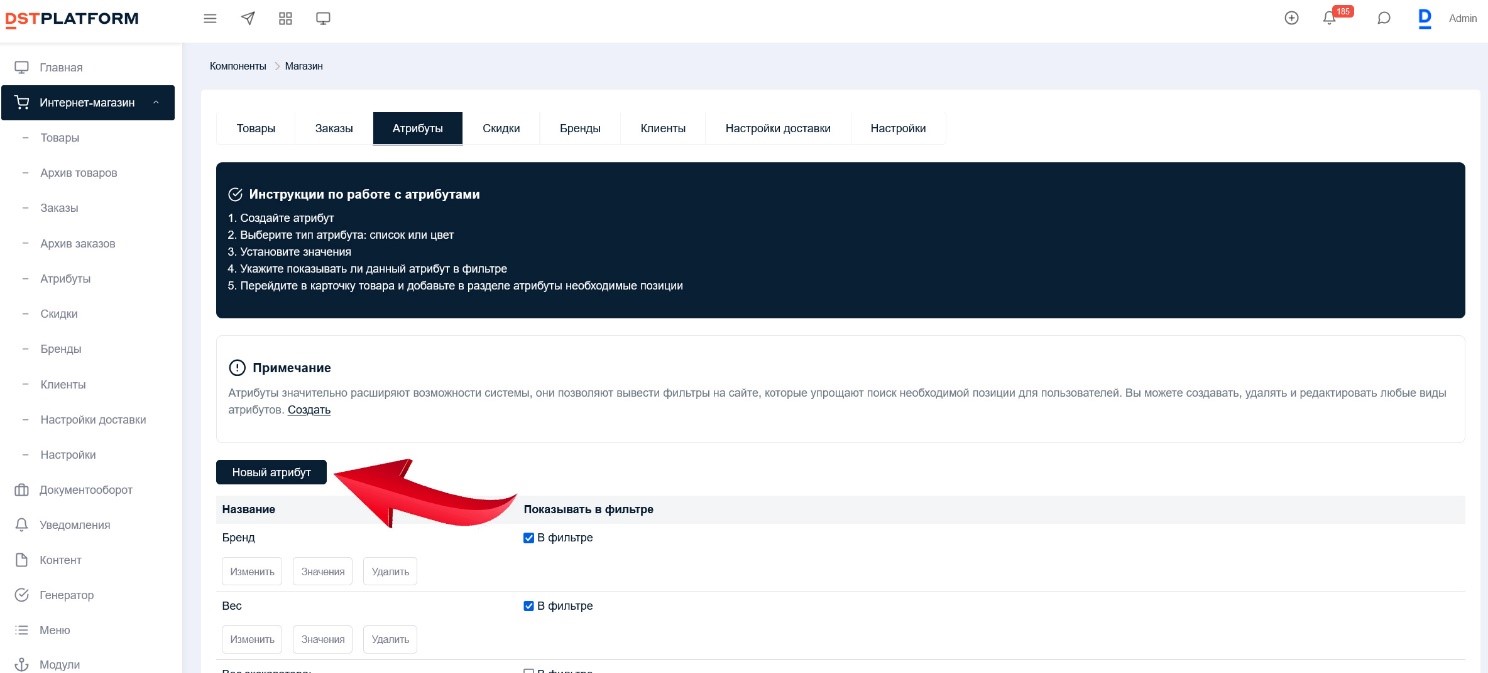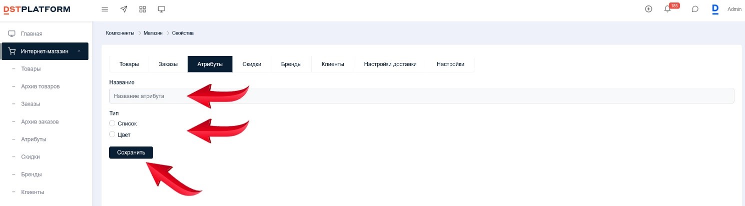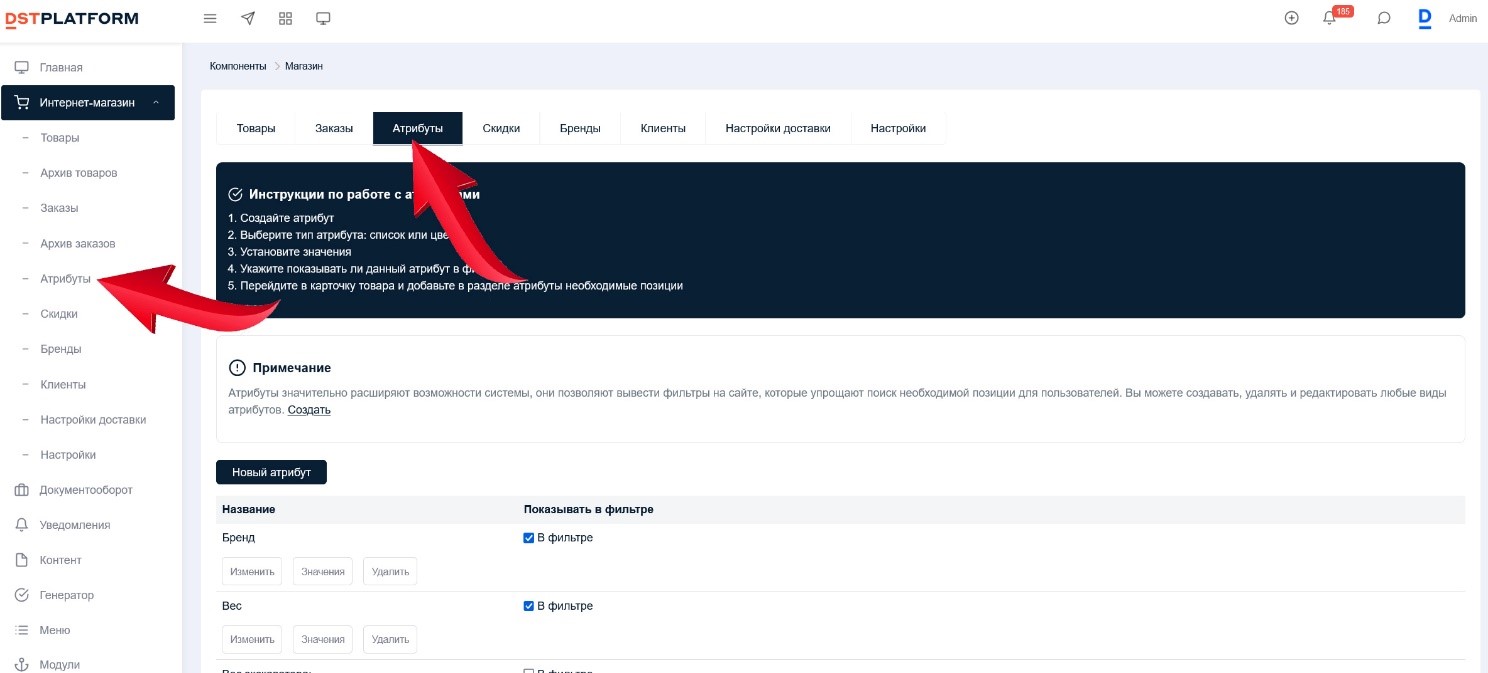 Добавление атрибутов находится в пункте меню «Интернет магазин» - под меню «Атрибуты».