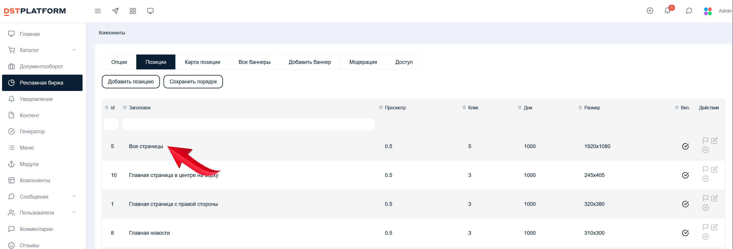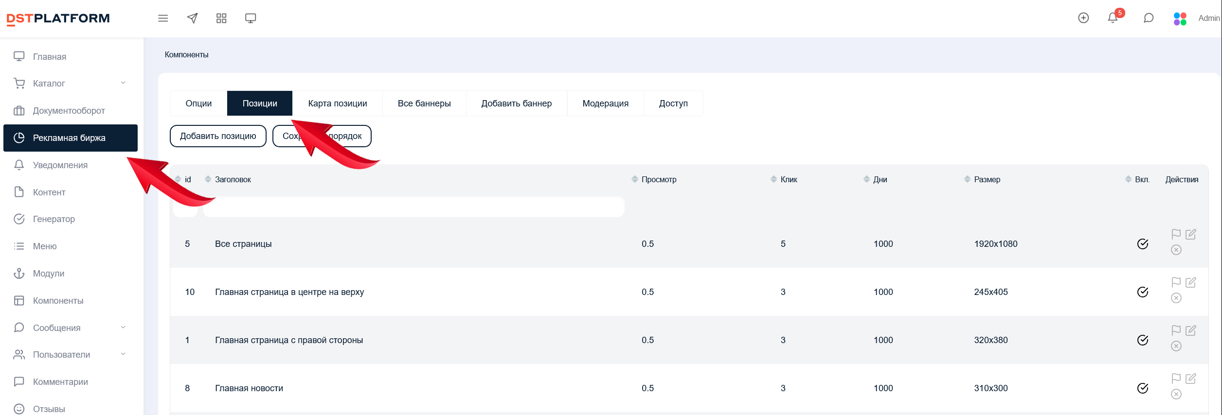 Управление ценами осуществляется в пункте меню  «Рекламная биржа»  под меню «Позиции».
