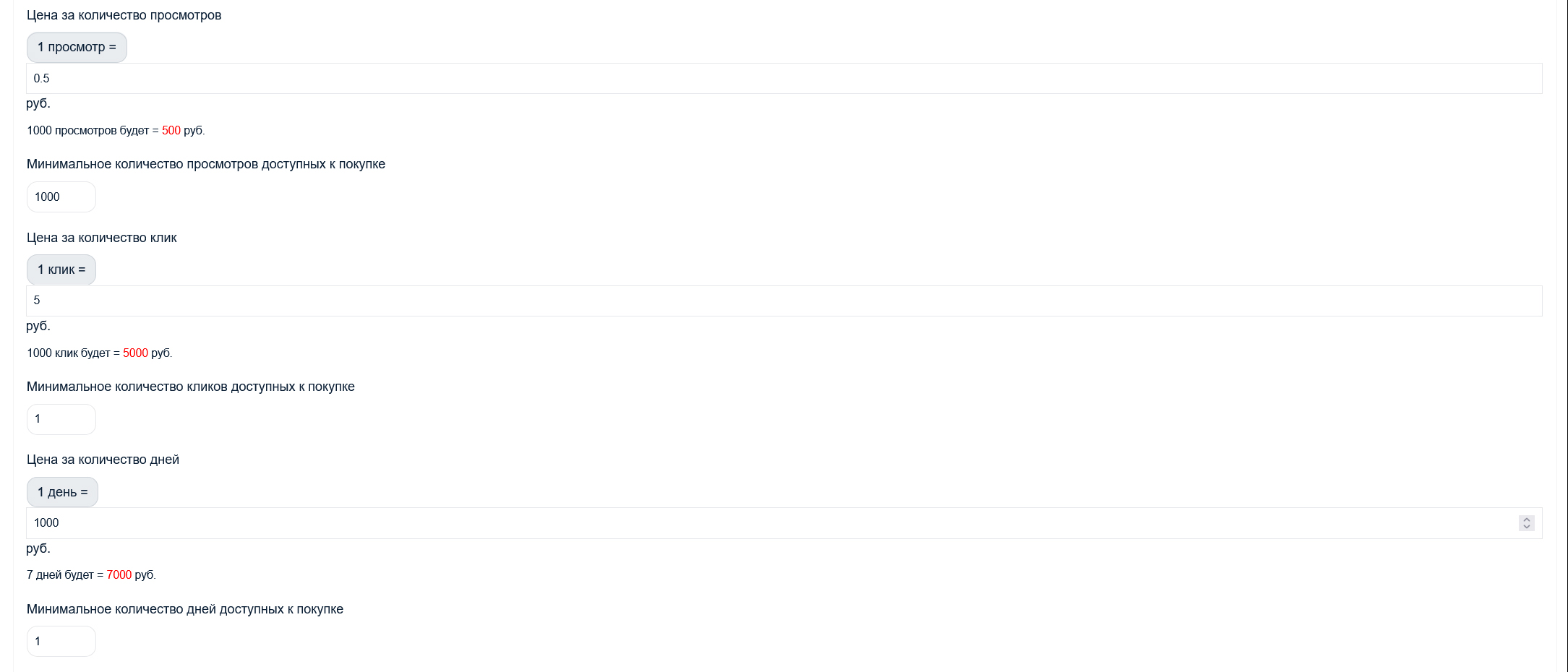 В полях формы установите цены для всех видов размещения (клики,  показы, дни размещения).