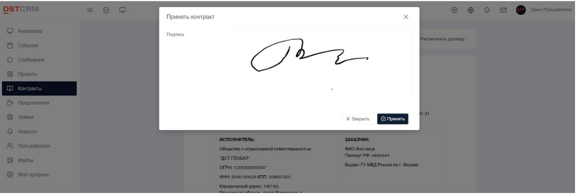В окне ввода подписи вводите свою подпись и нажимаете кнопку принять. Документ подписан,