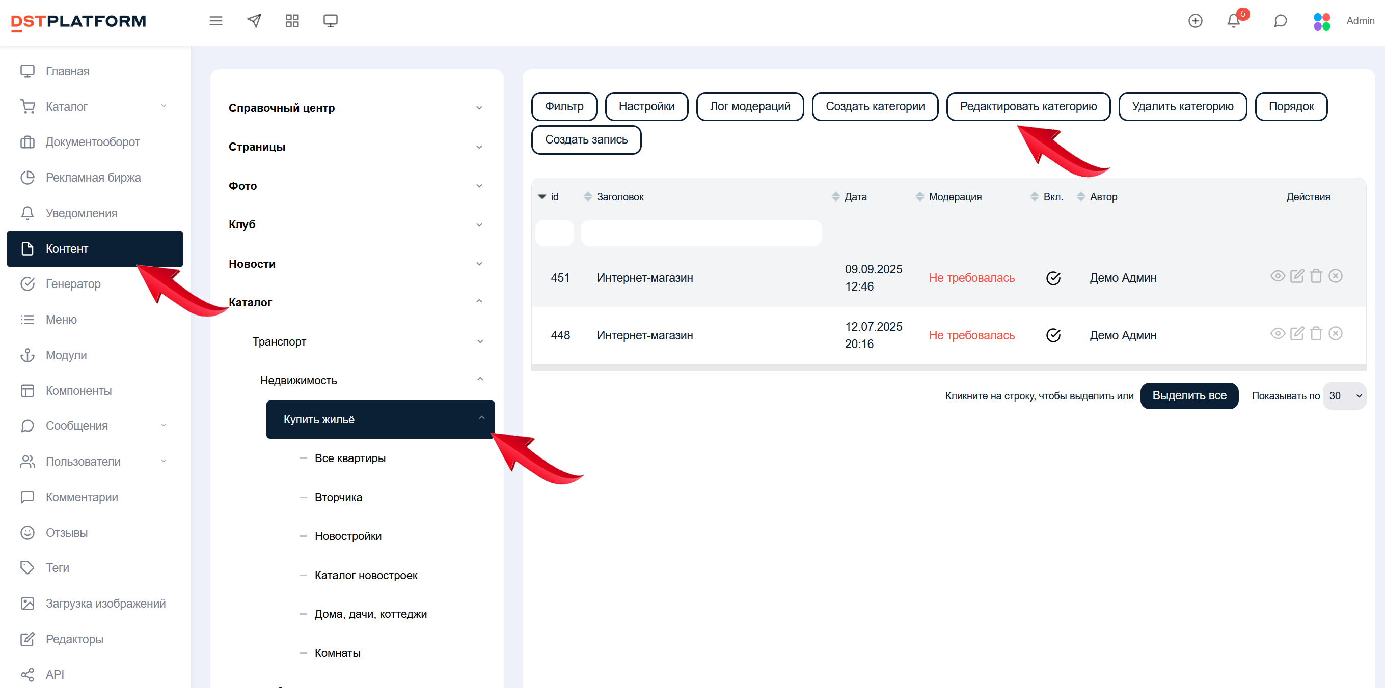 Перейдите в раздел «Контент» и выберите пункт «каталог». В Каталоге выберете нужную категорию, чтобы активировать ее и нажмите кнопку «Редактировать категорию».