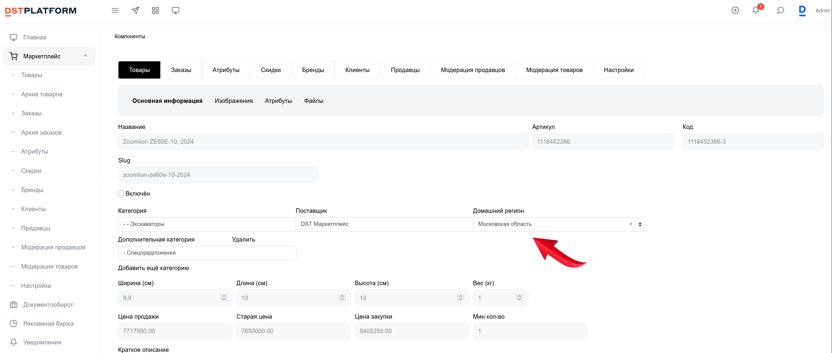 При создании карточки товара продавец указывает свой «Домашний регион» — место фактического нахождения товара на складе.